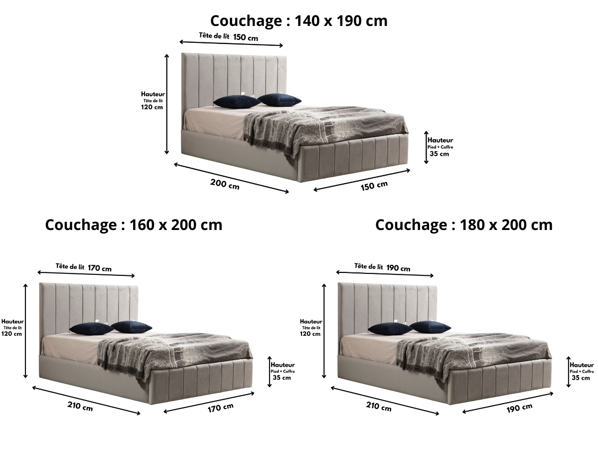 Structure & Matière : Cadre et Tête de lit en panneau agglomérer, capitonnage Mousse HR, Tissu Velours.