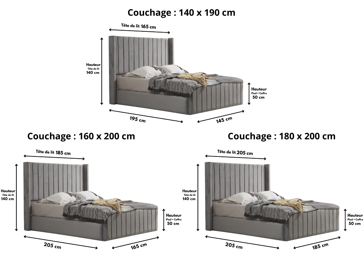 Structure & Matière : Cadre et Tête de lit en panneau agglomérer, capitonnage Mousse HR, Tissu Velours.